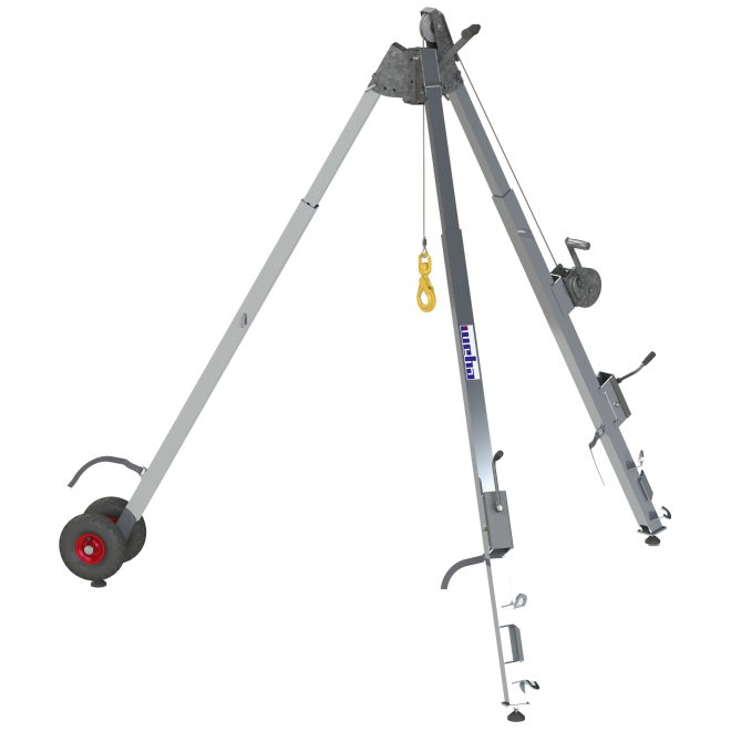 - Tragfähigkeit 1000kg - Gewicht 45 kg - inkl. Seilwinde und drehbarem Lasthaken - schnelle Montage ohne Werkzeug - teleskopierbare und klappbare Füße