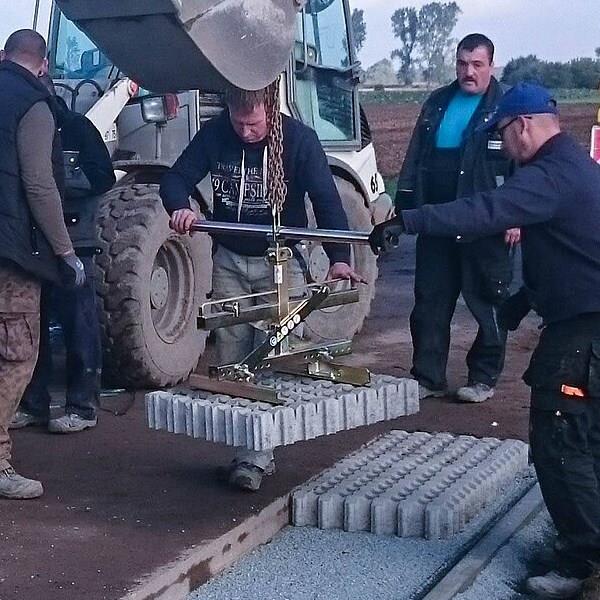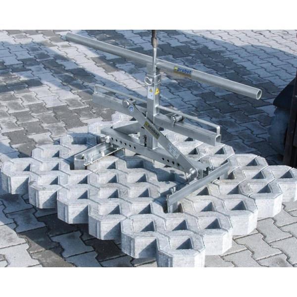 Das Komplettgerät ist für Rasengittersteine 60x40cm Lochmass 9x9cm geeignet. Die Zange kann 1 - 5 Steine gleichzeitg verlegen. Sie ist halbautomatisch und kann manuell von "voll" auf "leer" umgeschaltet werden. Das Gerät kann sowohl manuell als dank der Einhängeöse auch mit den Kran benutzt werden.