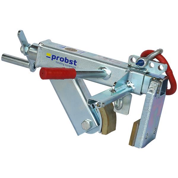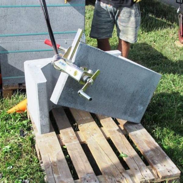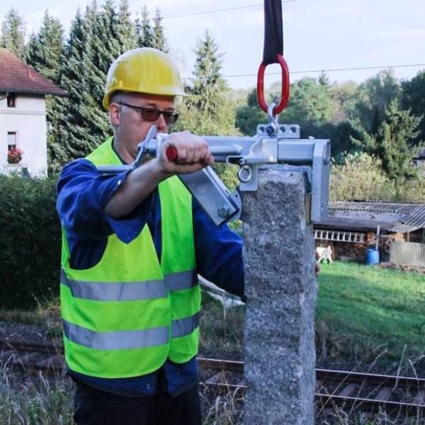 Speziell entwickelte Hebezange zum Aufrichten und Versetzen von Granitstelen. Beim Anheben tritt eine automatisch wirkende Spannkrafterhöhung ein und die Stele lässt sich sicher aufrichten und versetzen.